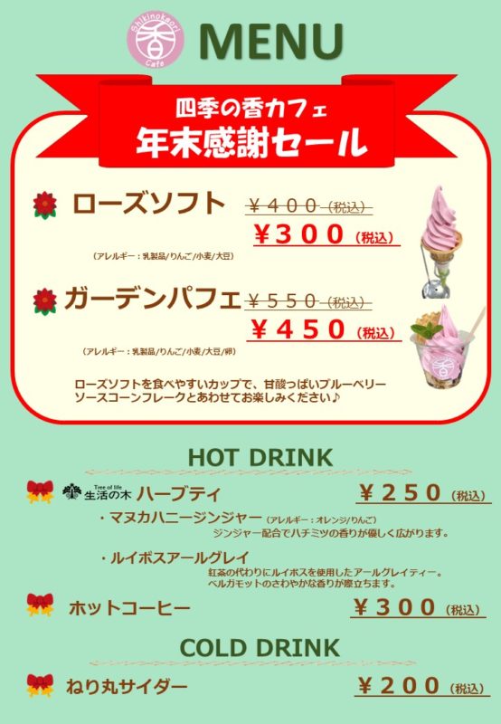 2023年のご愛顧に感謝いたしまして、四季の香カフェ“ソフト・パフェ100円引きセール”を2日間開催いたします。