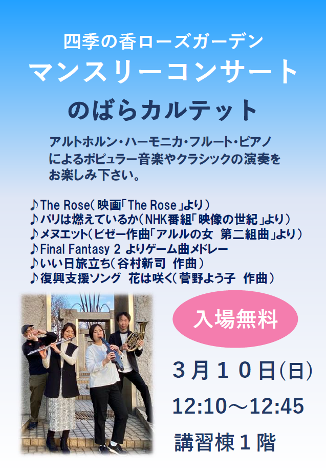 四季の香ローズガーデンでは、3月10日(日)にマンスリーコンサートを開催いたします。