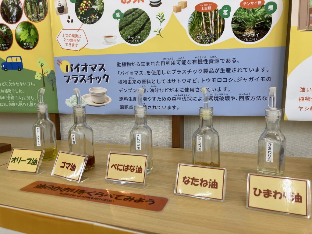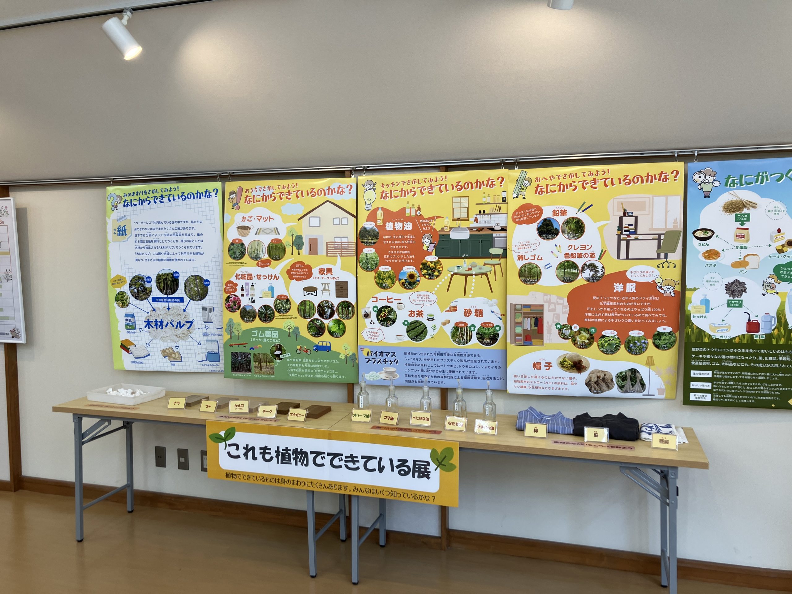 身のまわりのある植物からできているものを、実物もあわせて展示しております。