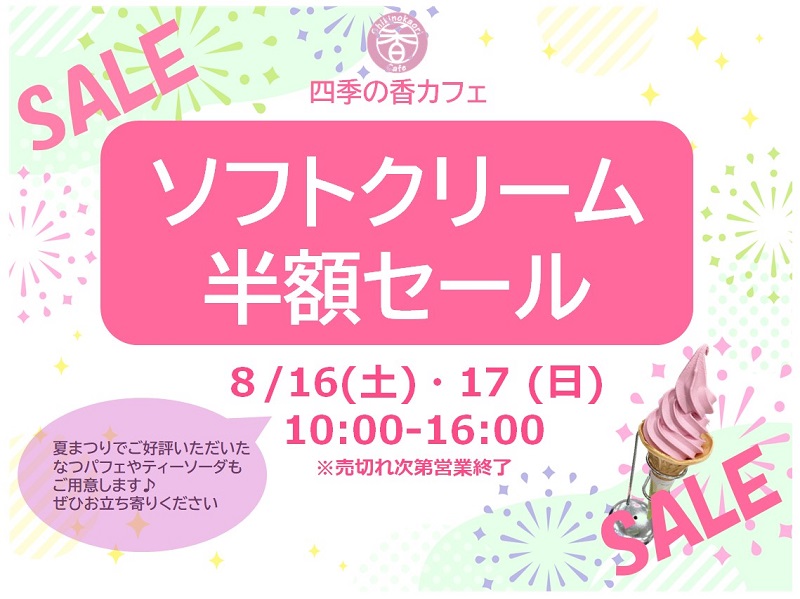8月は2日間限定でローズソフト半額セールを開催いたします。7月の夏まつりでご好評いただいた、氷を使ったなつパフェやティーソーダもご用意!この機会にぜひ、ご賞味ください。 皆さまのご来店をお待ちしております。